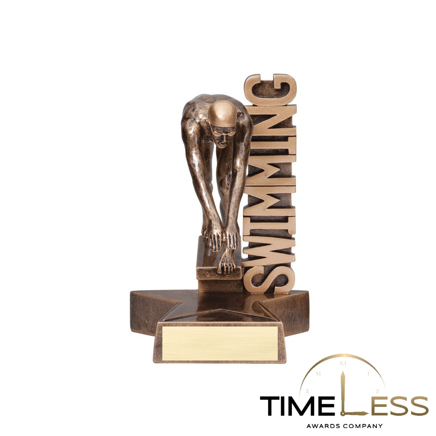 This trophy has a diving swimmer diving off of a diving board perched atop a star with the word swimming next to the figure. This trophy is customizable with a plate on the base. Bulk quantities may be available. Please contact us for more information and prices.