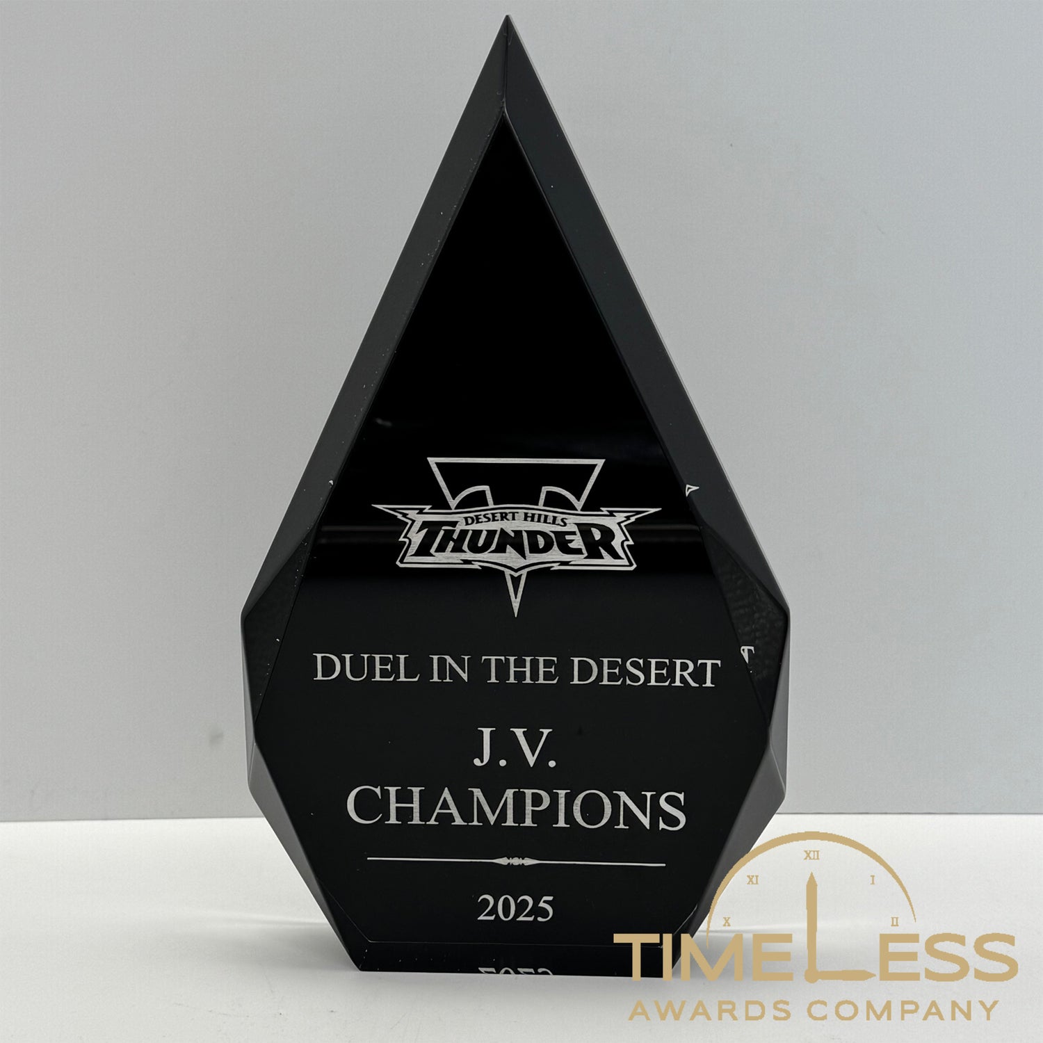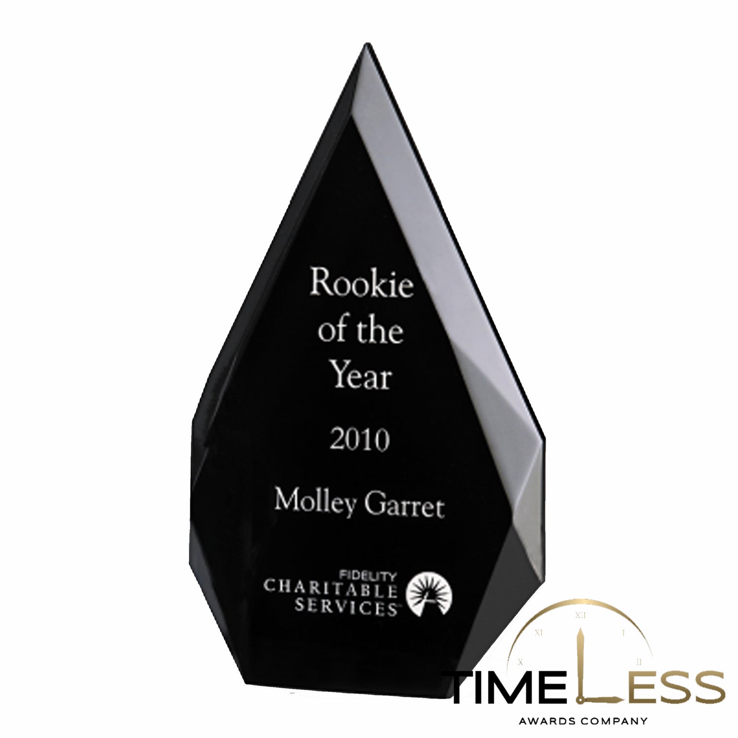 Flame Series clear acrylic award with black silk screening. Laser engraved copy jumps off the black background with a dramatic effect. Engraved to your specifications using your artwork, logo and personalization information. An ideal recognition award to acknowledge sales, safety, scholarship, service, charitable donations or any significant achievement. Produced from one inch thick, high quality acrylic this award stands firmlyon any shelf or desktop. Individually gift boxed.