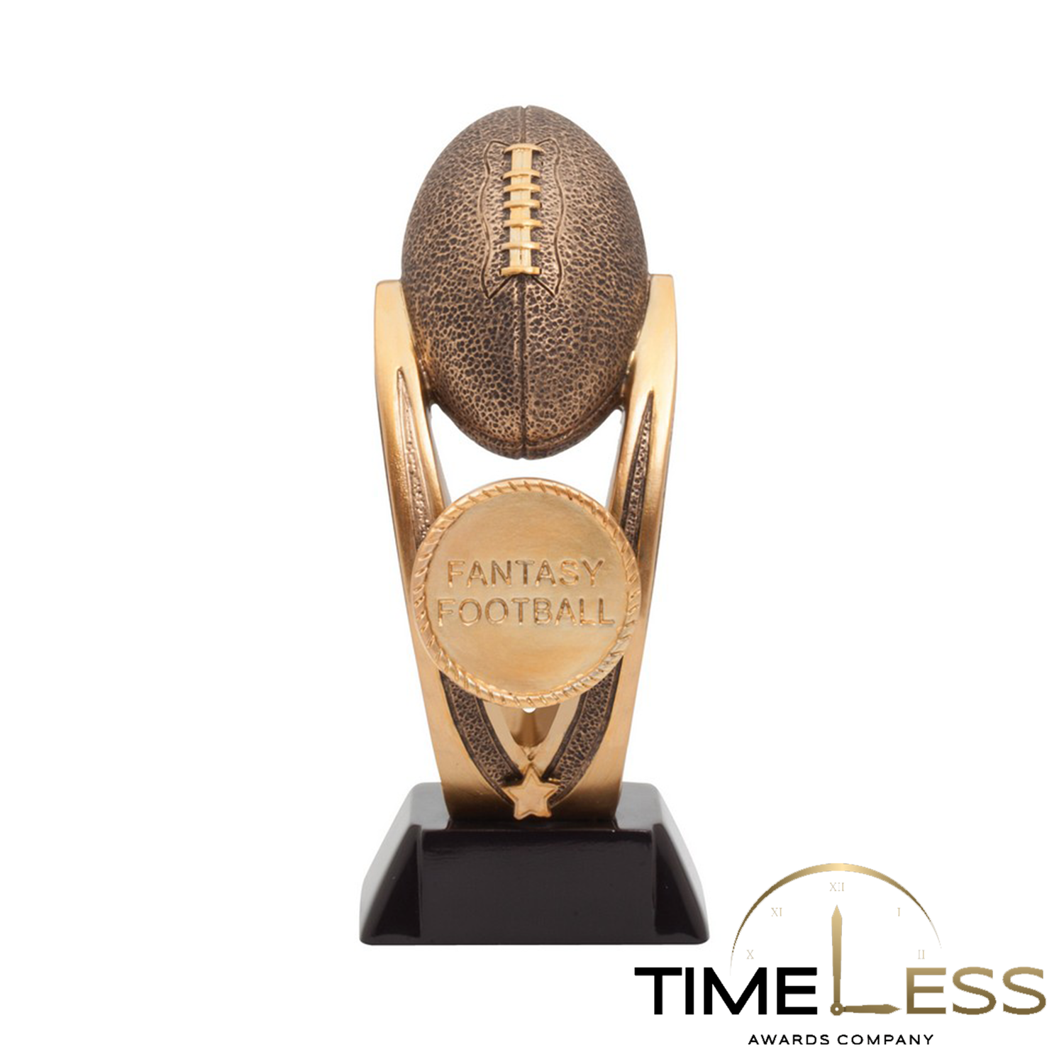 This trophy features a football on a gold stand with a black base. This trophy can be personalized and stand alone or be customized to fit your needs. Bulk quantities may be available. Please contact us for more information and prices.