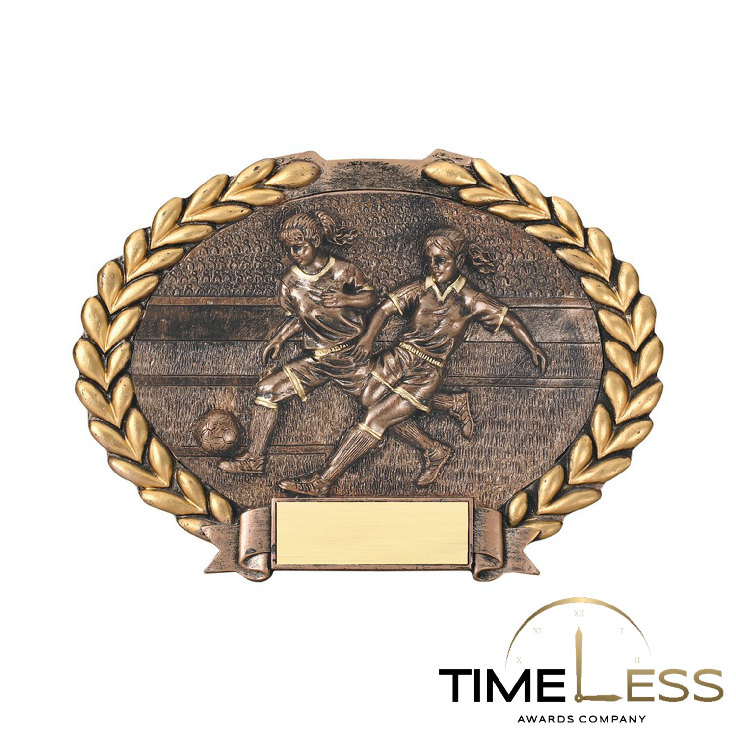 This gold and bronze female soccer plate can stand on its own or be mounted on a plaque. This plate can also be customized at the bottom. Bulk quantities may be available. Please contact us for more information and prices.