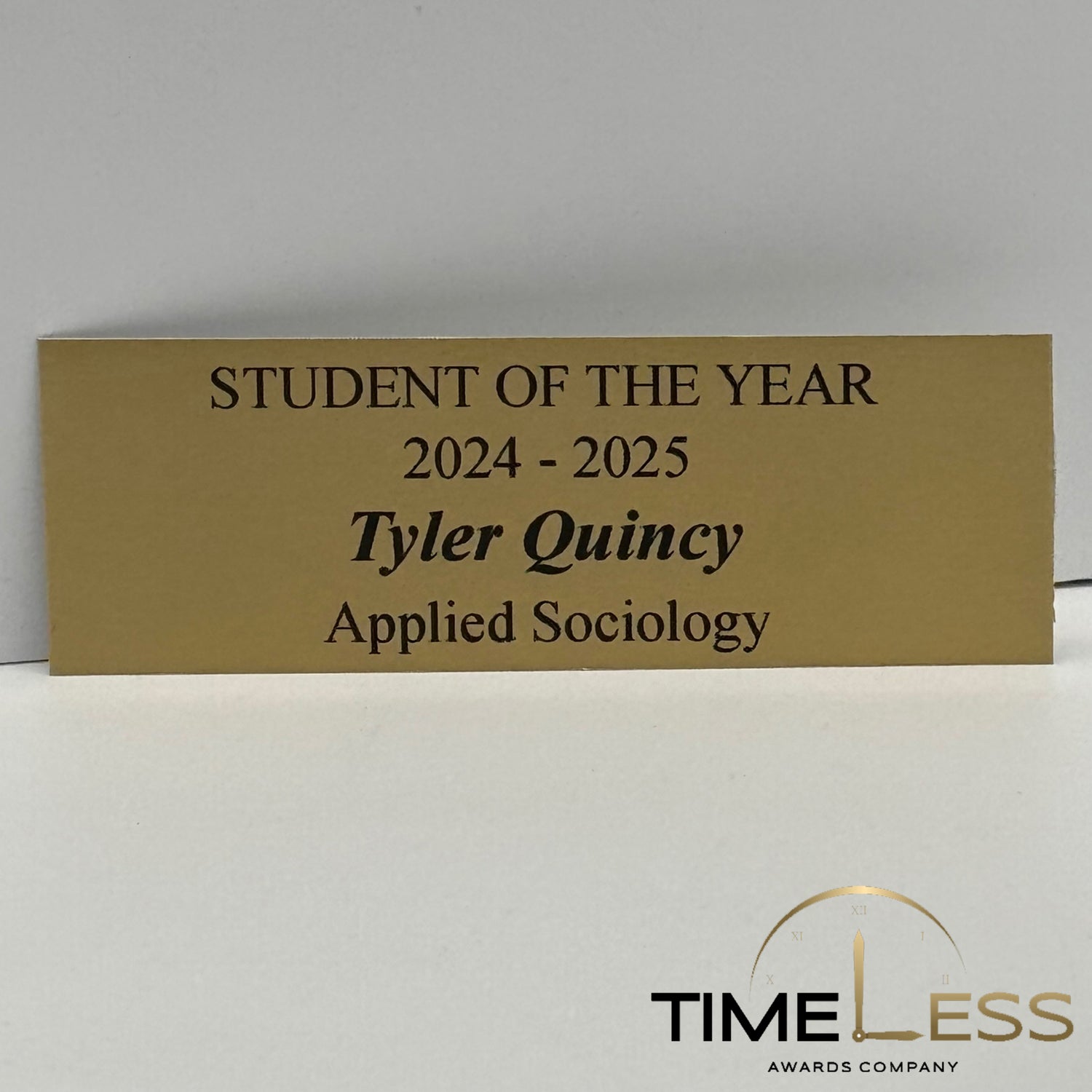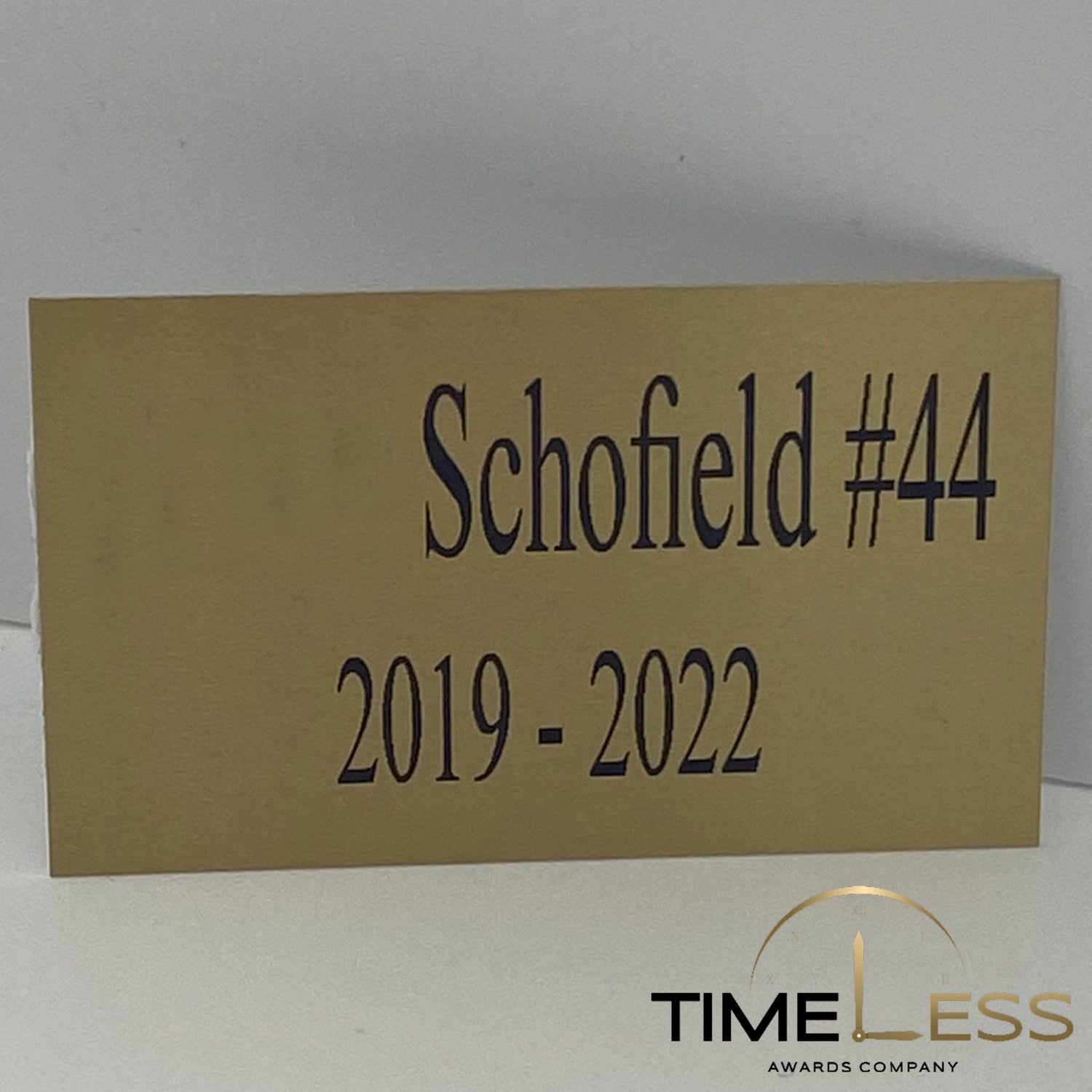 Customize your frames, boxes, hobbies, and more with these fully customizable and full color gold plates. .020" thick. 1 Sided. These are custom cut to any width and lenght. Pricing varies on sizing. Includes backing tape for mounting.