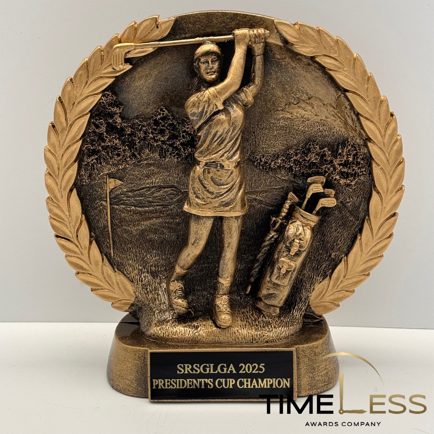 This Female Golf Award has a beautiful highly polished bronze finish with gold accents. The gold wreath design is on a circular plate with the figure sculpted on the front. The base size is approximately 2 1/2" x 4 3/4". At 7 1/2" overall height, the plate width is approximately 6 1/2".