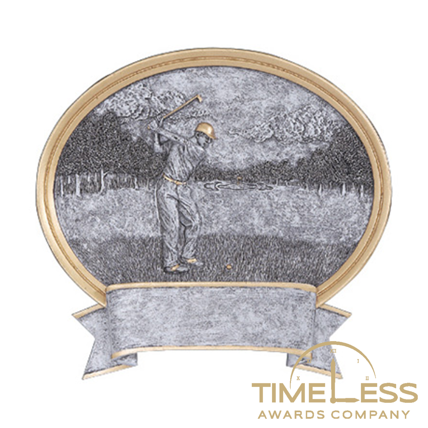 This gold & pewter oval resin plaque features golfers and is fully customizable. A large area at the bottom of the award can accommodate your personalization needs while the gold and pewter finish complement the look of the award. This item can either be hung on a wall or placed on a desk using the included stand. Bulk quantities may be available. Please contact us for more information and prices.