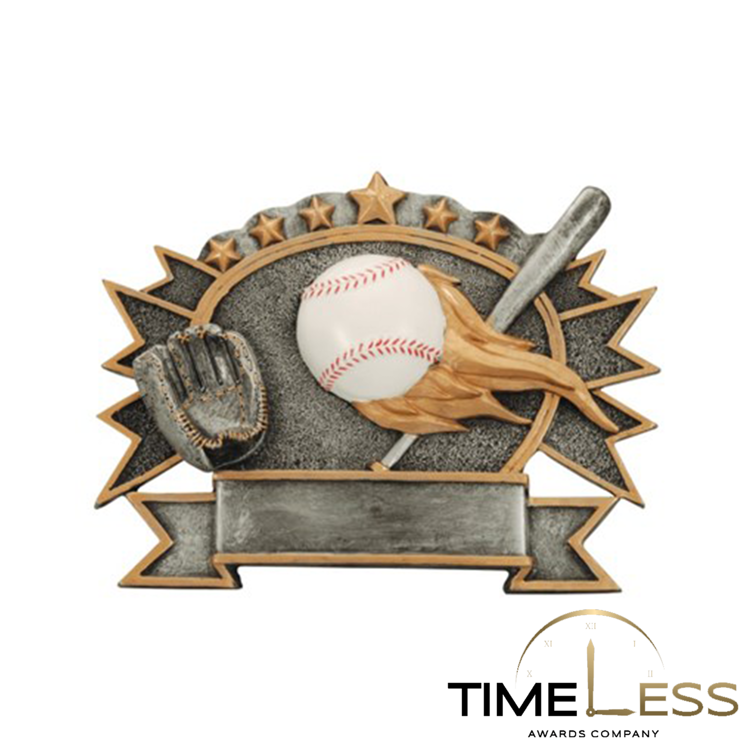 This award features a baseball, glove, and bat. A large area at the bottom of the award can accommodate your personalization needs while the gold and pewter finish complement the look of the award. This item can either be hung on a wall or placed on a desk using the included stand. Bulk quantities may be available. Please contact us for more information and prices.