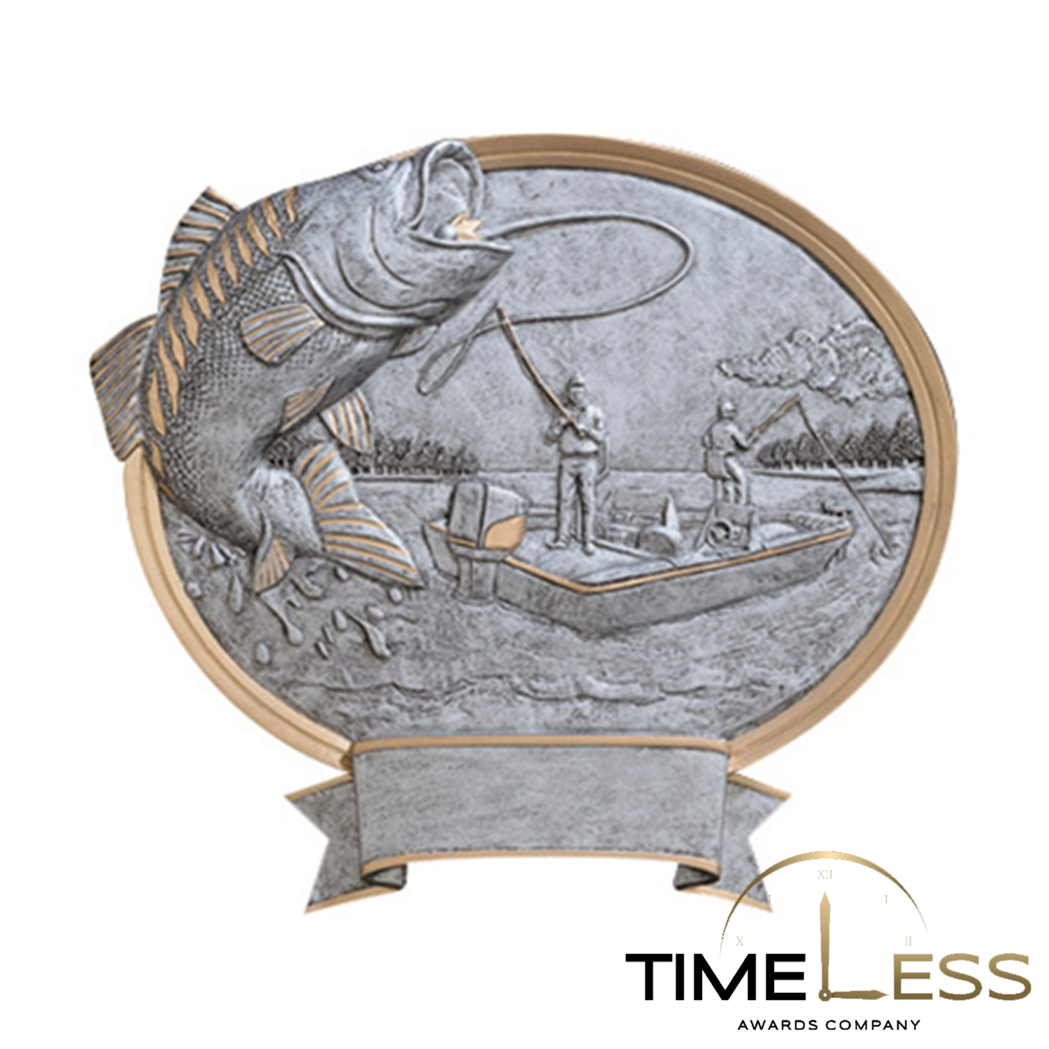 This gold & pewter oval resin plaque features a bass fish and is fully customizable. A large area at the bottom of the award can accommodate your personalization needs while the gold and pewter finish complement the look of the award. This item can either be hung on a wall or placed on a desk using the included stand. Bulk quantities may be available. Please contact us for more information and prices.