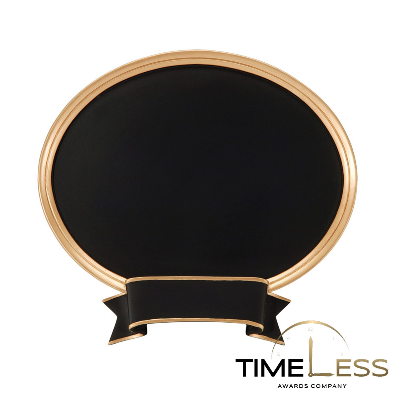 This gold & pewter oval resin plaque features a black blank slate and is fully customizable. A large area at the bottom of the award can accommodate your personalization needs while the gold and pewter finish complement the look of the award. This item can either be hung on a wall or placed on a desk using the included stand. Bulk quantities may be available. Please contact us for more information and prices.