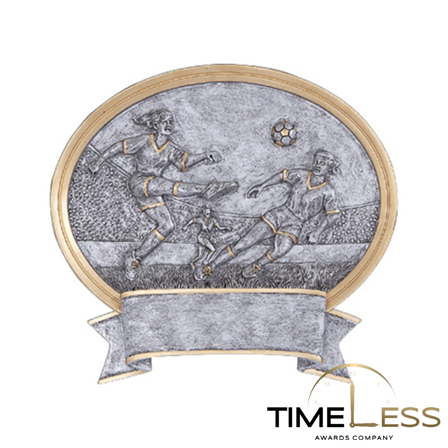 This customizable gold & pewter oval resin plaque is perfect for the female soccer player in your life. A large area at the bottom of the award can accommodate your personalization needs while the gold and pewter finish complement the look of the award. This item can either be hung on a wall or placed on a desk using the included stand. Bulk quantities may be available. Please contact us for more information and prices.