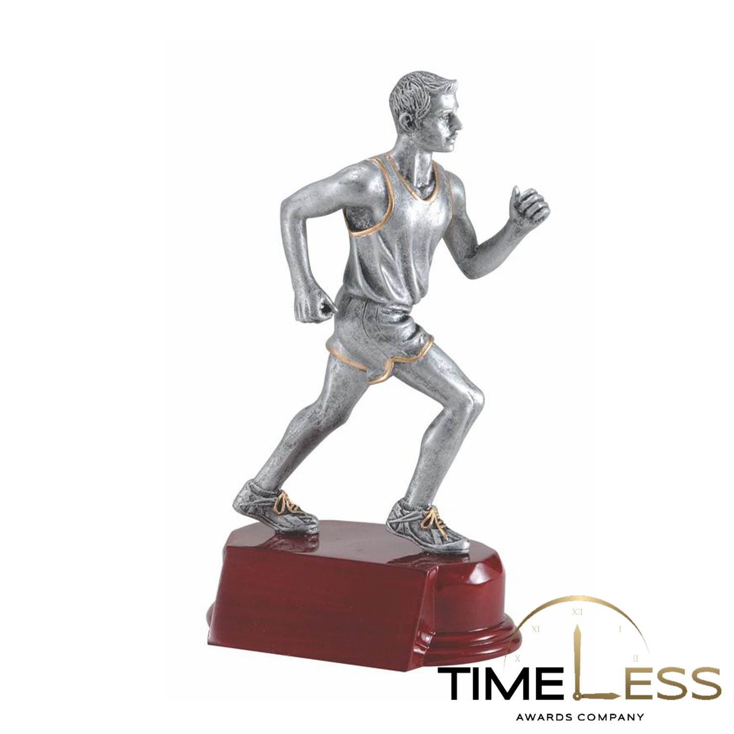 This trophy features a male track athlete on a cherry wood base. This trophy includes personalization on the base.