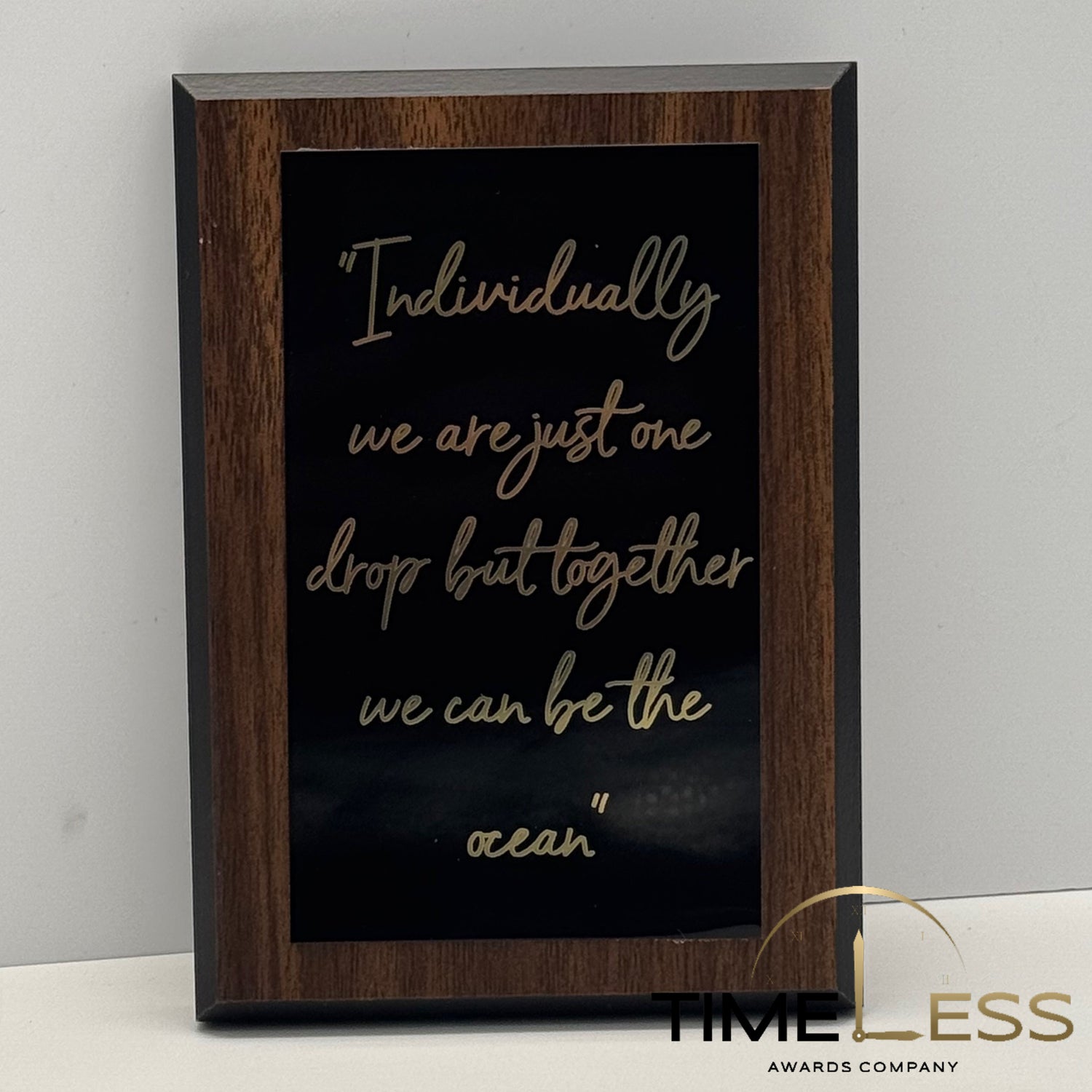 This is a walnut finished wood plaque with black edges. It comes with a custom engraved plate. Sizes, colors and materials for plate vary. Please contact us for more information, to customize your plate and/or for bulk prices. Full Color sublimated plates also cost extra. Please ask for a quote today!